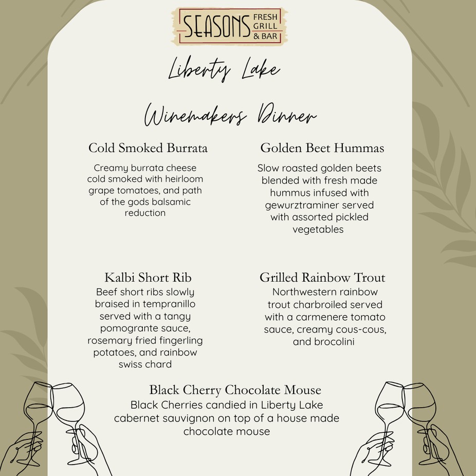 Join us for a Liberty Lake Winemakers Dinner at Seasons Fresh Grill & Bar in Coeur d’Alene on March 23rd at 6:00 PM.