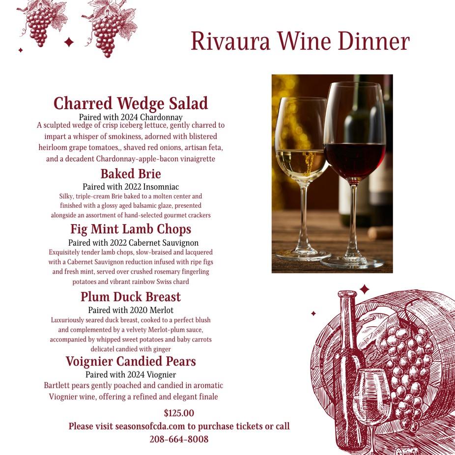 Join us at Seasons of Coeur d’Alene for a special Rivaura Winemakers Dinner on February 16th at 5 PM for $125. This ex-clusive evening will feature a thoughtfully crafted multi-course menu paired with Rivaura wines, highlighting the winery’s distinctive character and craftsmanship. Each course is designed to complement the featured selections, offering guests a guided tasting experience that showcases balance, flavor, and seasonal ingredients. Seating is limited, and reservations are recommended for this one-night-only culinary and wine pairing event.